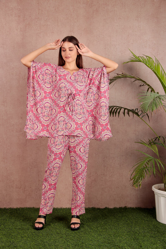 Pink & White Abstract Print Viscose Rayon Kaftan Co-ord Set
