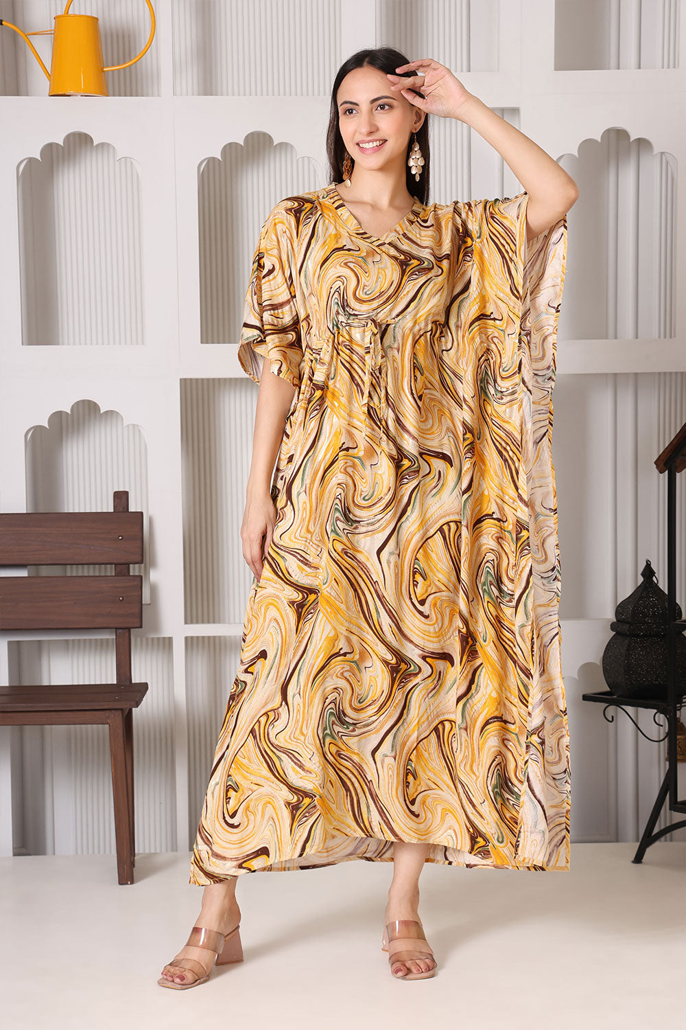 Marble Muse Magic Maxi – Yellow Beige Tones Brighten your look with this eye-catching maxi dress featuring a fluid swirl print in mustard yellow, beige, chocolate brown, and touches of olive green. Designed in a relaxed kaftan silhouette with a cinched drawstring waist, it's your perfect pick for effortless elegance and all-day comfort.