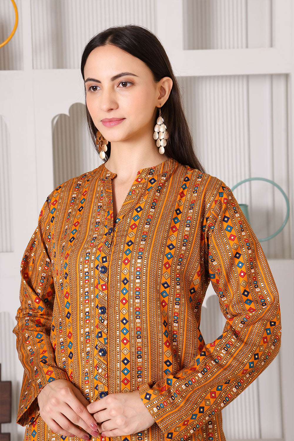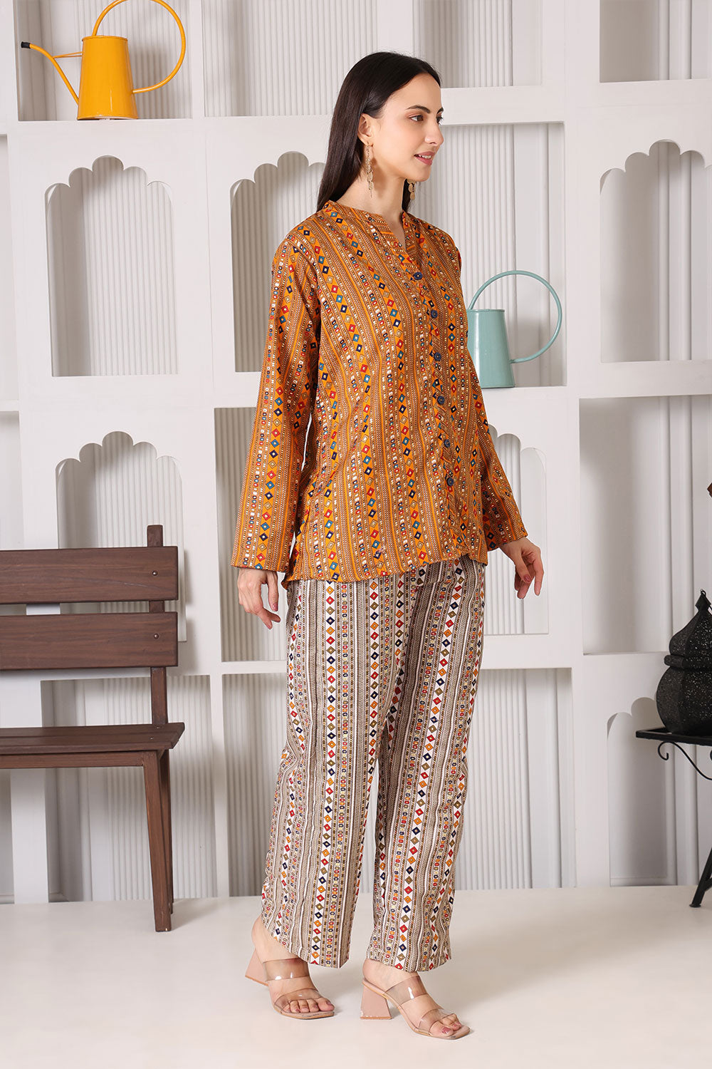 Elevate your everyday style with this beautifully coordinated ethnic set, featuring a Burnt Orange printed Shirt paired with contrasting cream straight Trouser. Crafted from soft, breathable fabric, this set blends traditional charm with modern comfort. Perfect for casual outings, office wear, or festive gatherings.