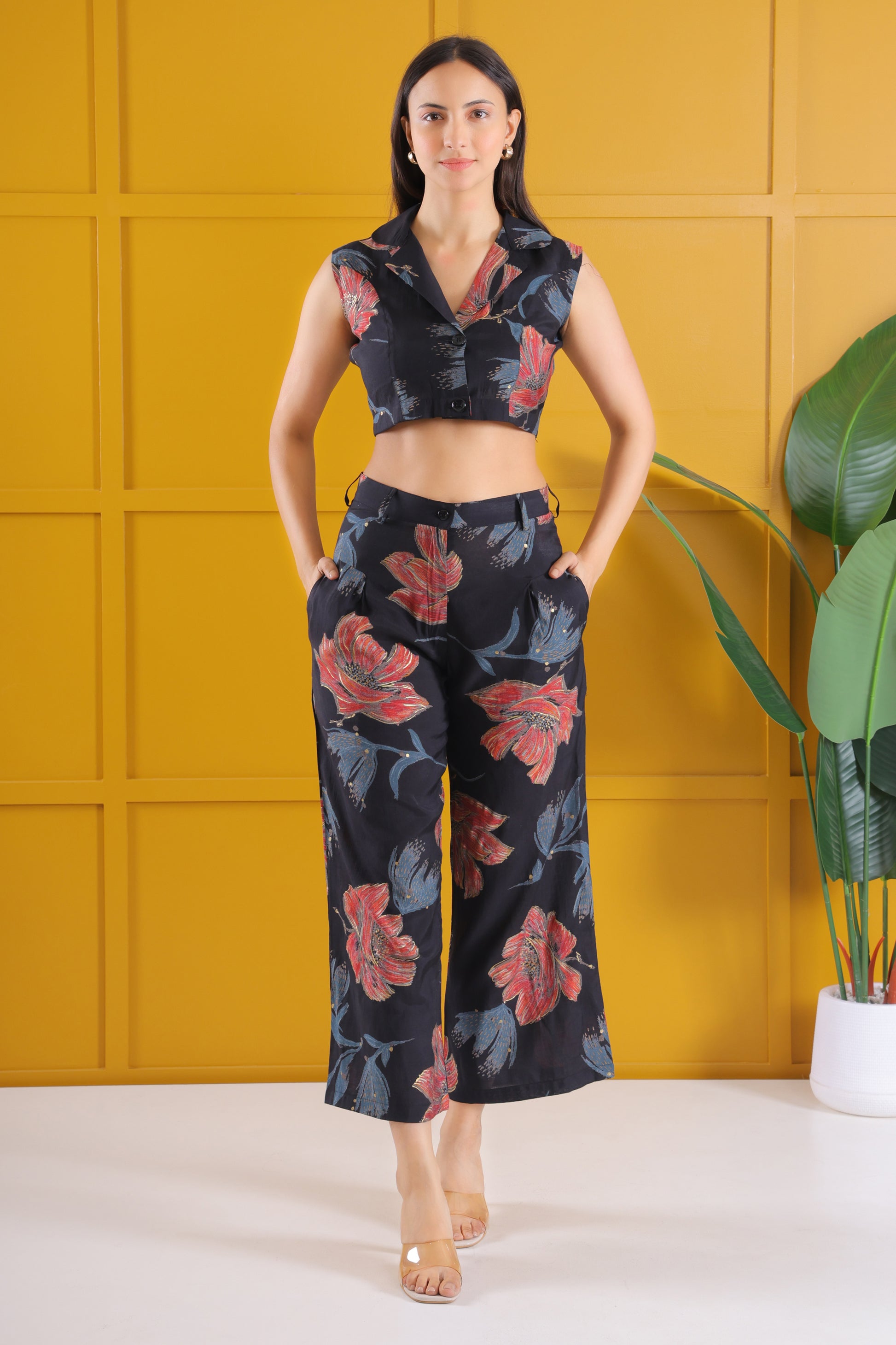 This co-ord set consist of short top & trouser. A black and red co-ord set with floral flair works across a variety of occasions. You can wear it casually for a chic day look or dress it up for an evening event. The bold colors combined with floral accents make it suitable for everything from a date night, a night out with friends, or a stylish day at work. The co-ord set allows you to look still feeling comfortable and stylish.