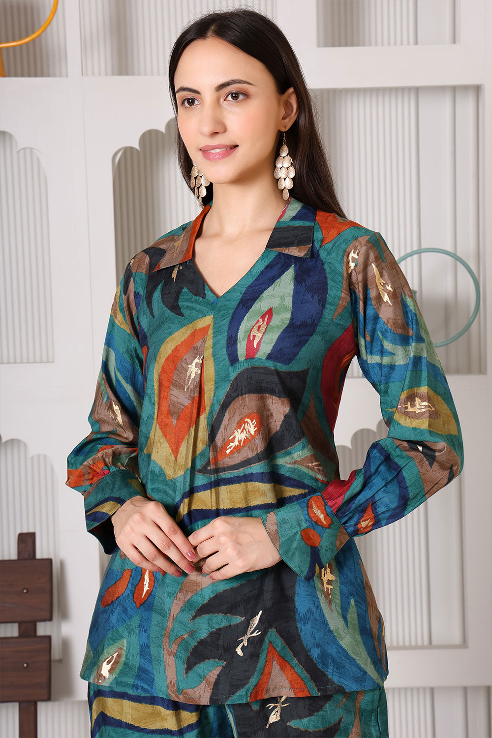 This co-ord set consist of shirt trouser. Green and red printed shirt and trouser has spread neck full sleeves, regular waist. Design creates a clean, unified look without compromising style. These sets are often crafted from soft, breathable fabrics like cotton, knit, or jersey, providing ultimate comfort for all-day wear. The loose-fitting or slightly tailored cuts allow ease of movement, making them great for lounging, running errands, or even casual outings.